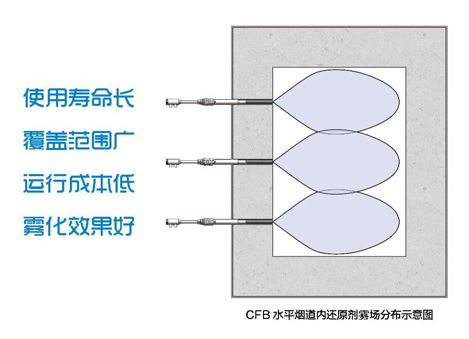 循環(huán)流化床鍋爐的水平煙道由于截面積小、煙氣溫度接近脫硝理想溫度,成為噴槍安裝的首選位置。我公司會根據(jù)現(xiàn)場實(shí)際情況和循環(huán)流化床水平煙道截面尺寸確定噴槍數(shù)量和布置形式,使還原劑霧場充分覆蓋煙道橫截面,確保還原劑與煙氣充分混合,從而達(dá)到最優(yōu)的脫硝效果。