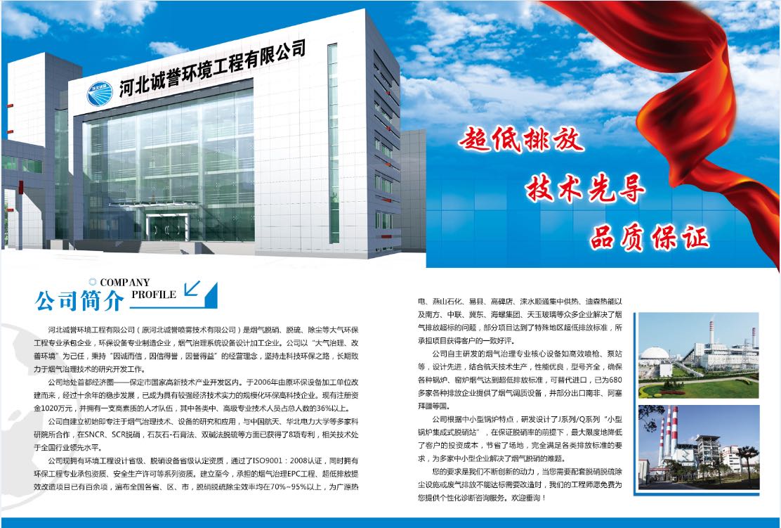 河北誠譽(yù)環(huán)境工程有限公司(原河北誠譽(yù)噴霧技術(shù)有限公司)是一家專業(yè)從事煙氣脫硫脫硝的高科技環(huán)保企業(yè)。公司擁有近二十年霧化經(jīng)驗(yàn),主要業(yè)務(wù)領(lǐng)域包括:SCR、SNCR脫硫脫硝系統(tǒng)設(shè)計(jì)、脫硝工程承包,各種規(guī)格型號脫硫脫硝噴槍噴嘴、霧化噴嘴噴槍的研發(fā)、生產(chǎn)及銷售。產(chǎn)品廣泛應(yīng)用于電力、水泥、化工、食品、制藥等行業(yè)。
