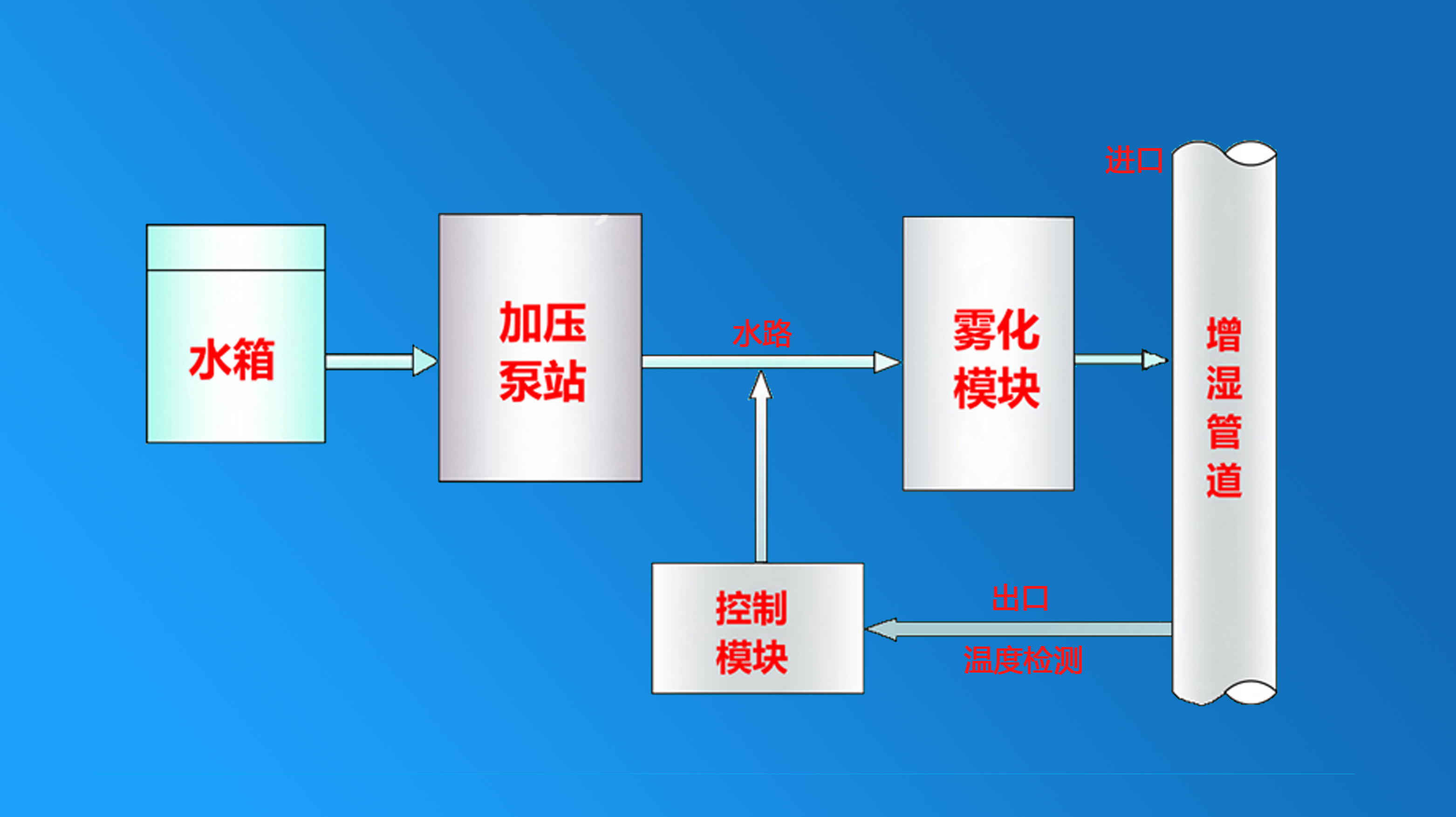 系統(tǒng)結(jié)構(gòu):該系統(tǒng)霧化噴槍固定在增濕塔錐體部位,整套設(shè)備由四部分構(gòu)成:一是壓縮空氣供應(yīng)系統(tǒng),與主排風機相連接;二是加壓供水系統(tǒng)。由立式多級離心泵帶電機和整套精密低壓閥門、過濾器等附件組成;三是增濕塔頂部霧化系統(tǒng)。由增濕塔頂部環(huán)管、噴槍、噴嘴、高壓伸縮軟管及精密閥門、過濾器等連接件組成。四是多功能控制系統(tǒng)。由氣、水壓力、溫度、流量測控器,低壓元器件和變頻器等組成完整閉路控制系統(tǒng)。